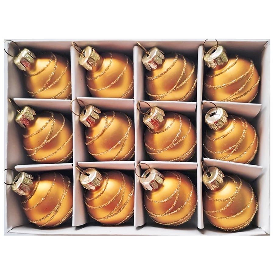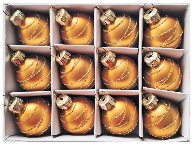 A doboz 12 darab csillámos díszítésű gömböt tartalmaz.