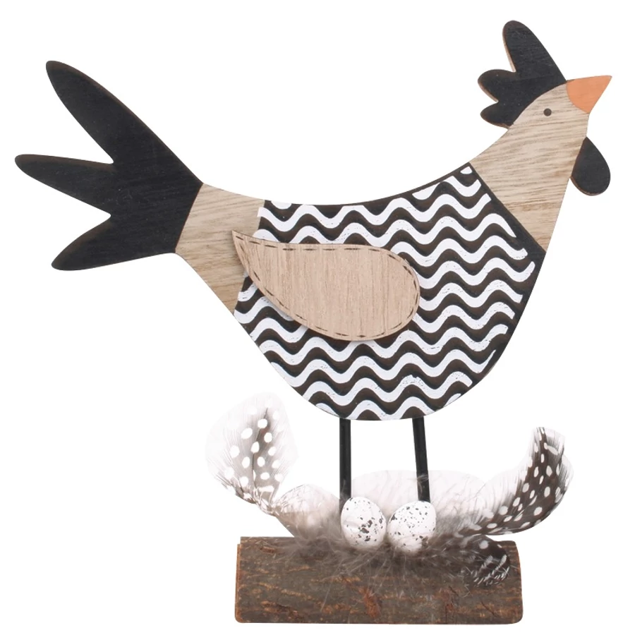 Egy fekete-fehér tyúk apró polisztirol tojásokkal és tollakkal egy fa állványon szinte bárhová elfér.