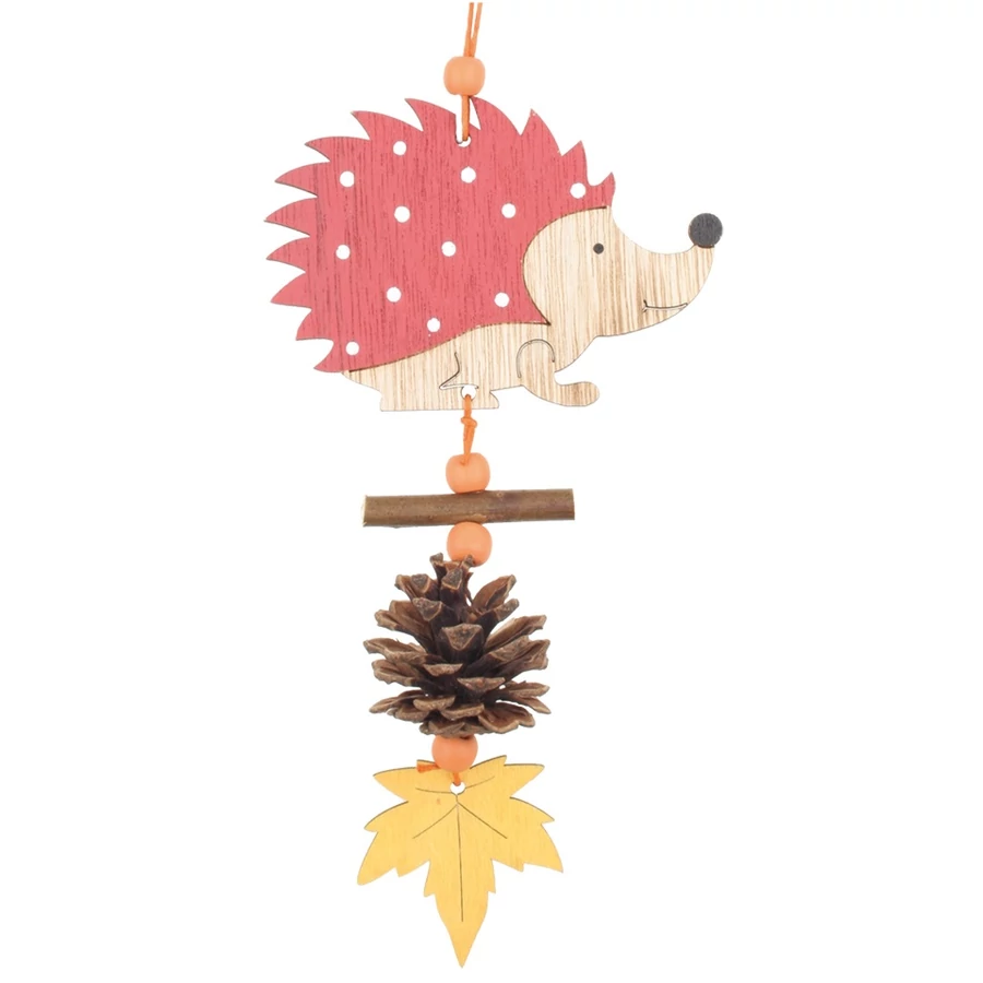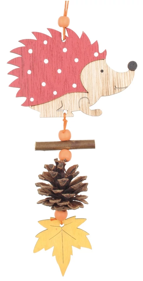 Teremts őszi hangulatot egy fából készült függő süni segítségével.